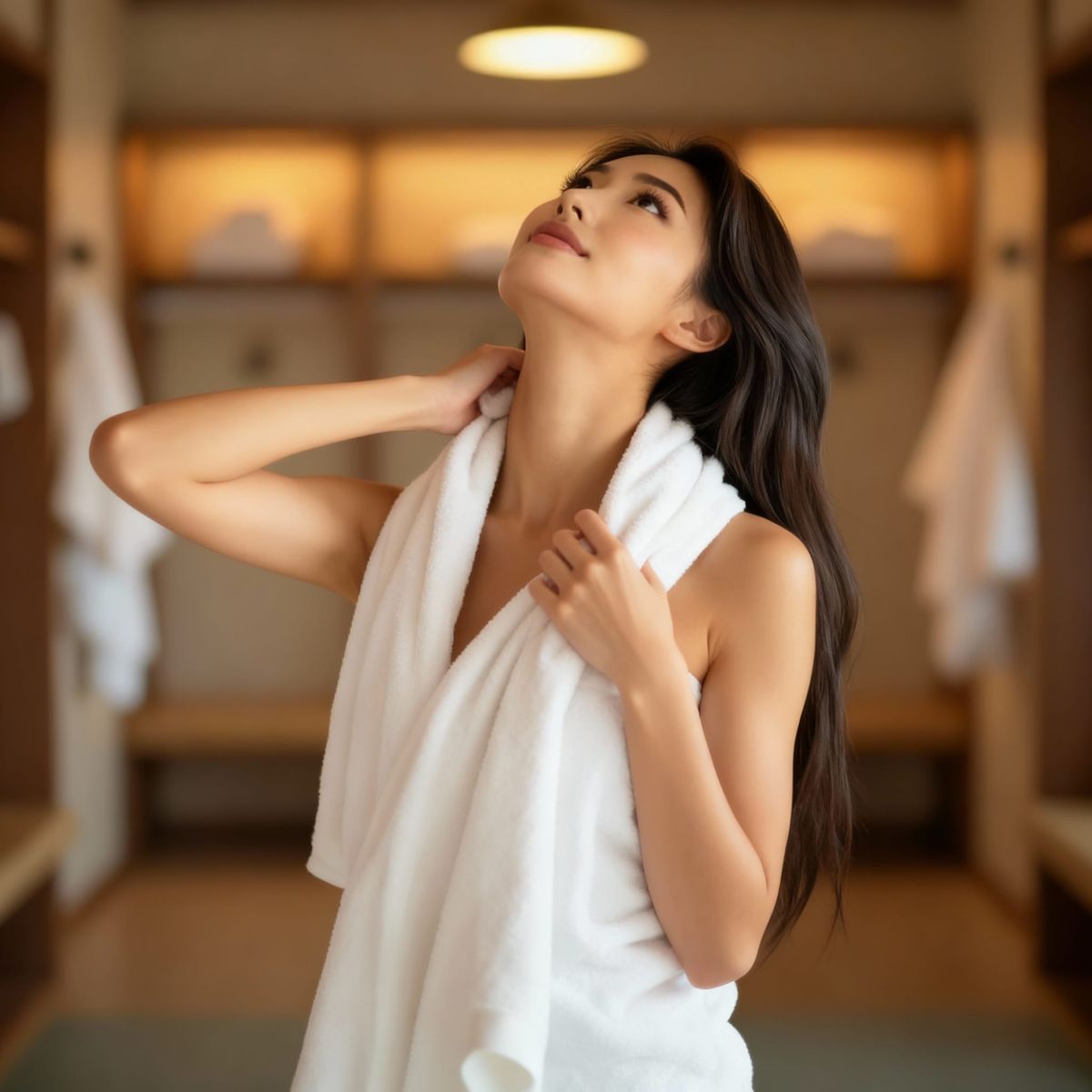 This image captures a serene moment of a fit Asian woman in a dojo locker room, towel in hand, feeling content after her training.