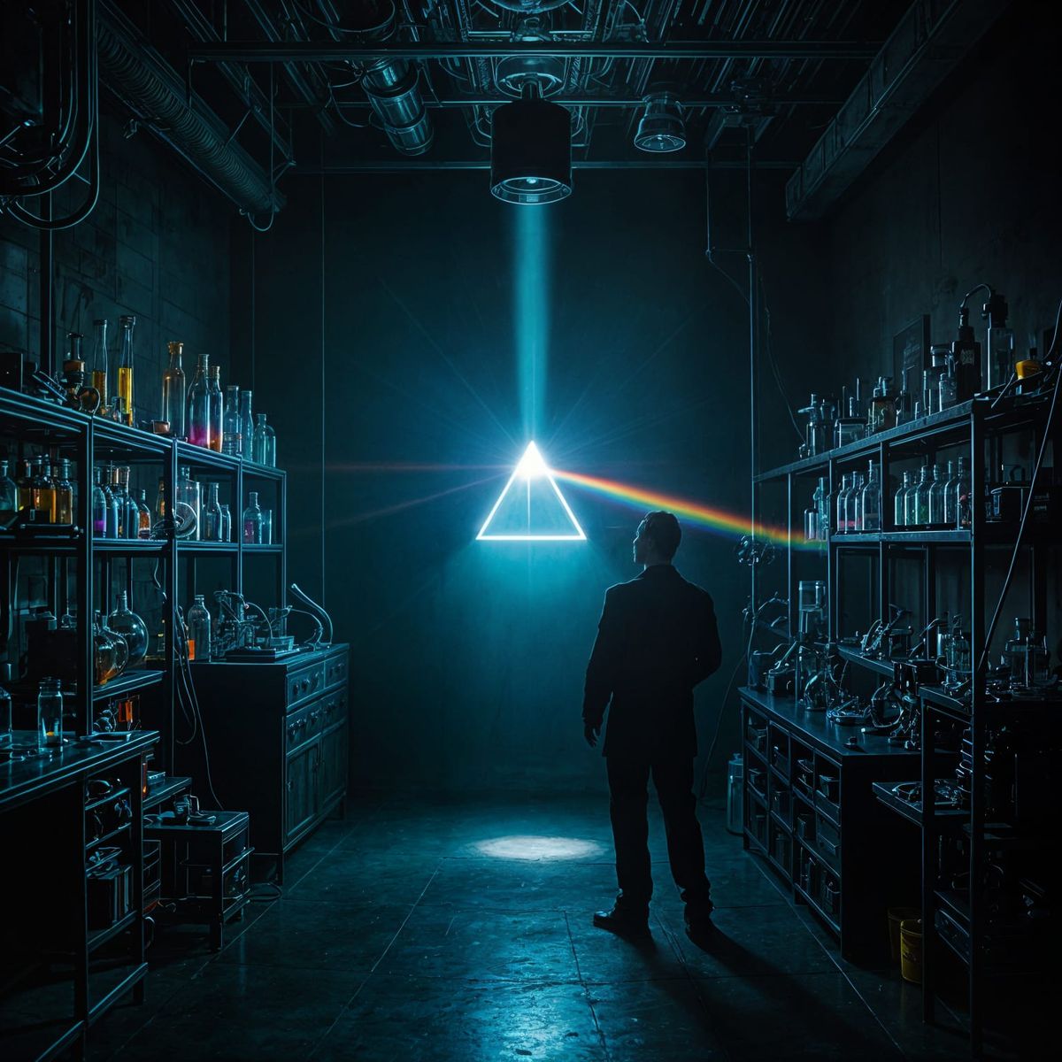 A lone figure is illuminated by a rainbow in a dark laboratory filled with scientific equipment. The image evokes classic science fiction with deep blues, purples, and greens.