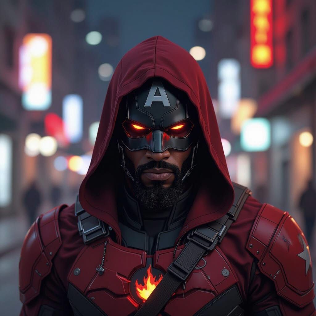 A digital rendering of a black man in a red and black armored suit and helmet. The suit features a fireball emblem, and the overall aesthetic blends dark noir with dynamic energy and gritty textures.