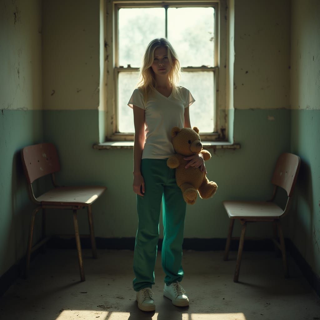 A hyperrealistic photo of a young woman in scrubs and a tee, holding a teddy bear in a decaying asylum examination room. Cinematic lighting and shallow depth of field create a haunting atmosphere.