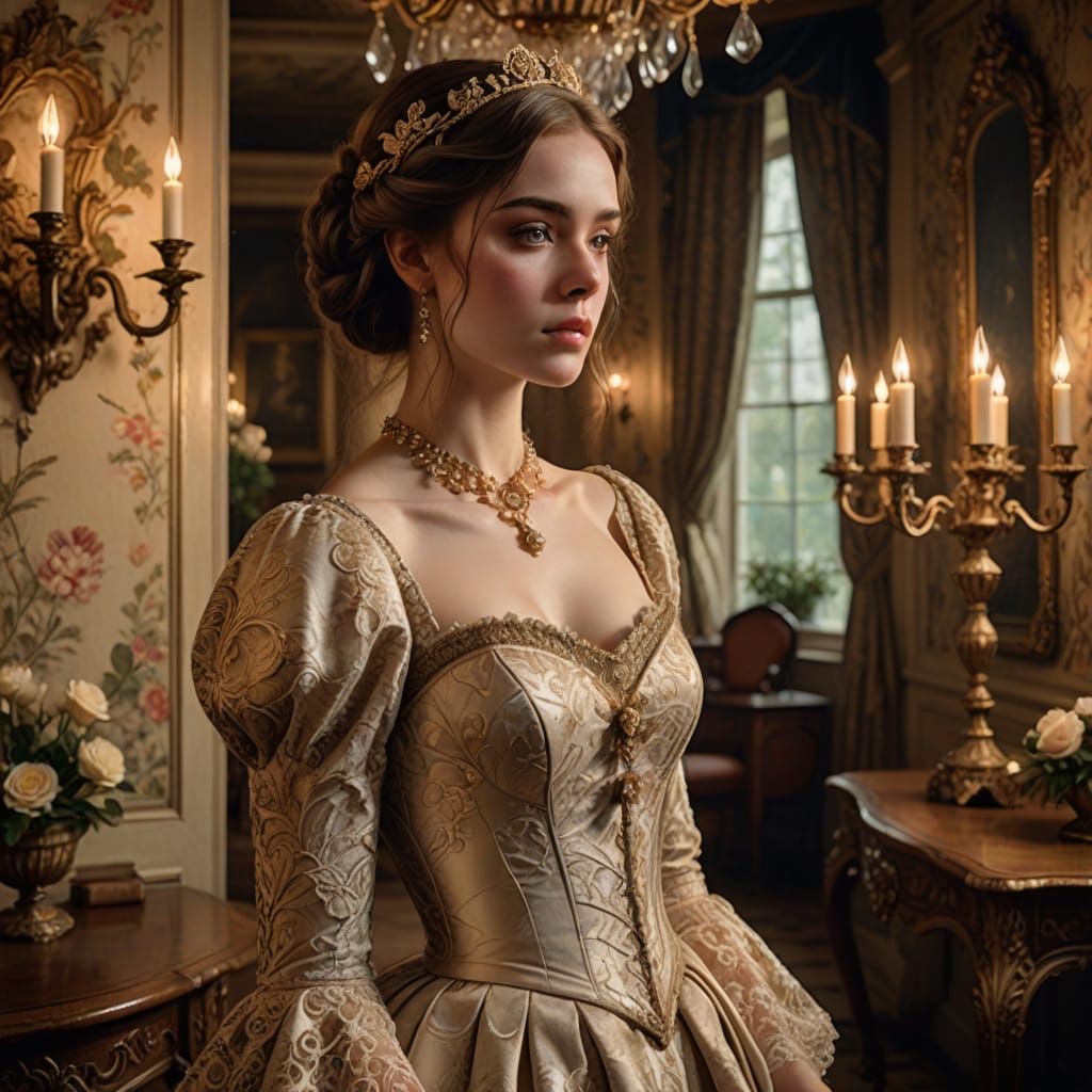 This stunning portrait captures a young woman's refined elegance, set against a backdrop of opulent luxury and ornate decor, reminiscent of Pre-Raphaelite masterpieces