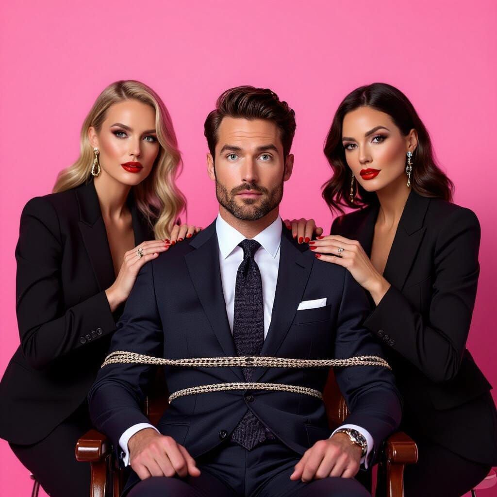 This image shows three women standing proudly over a man tied to a chair, against a vibrant pink backdrop. The photo has a cinematic aesthetic, with realistic details and high quality, reminiscent of famous photographers.