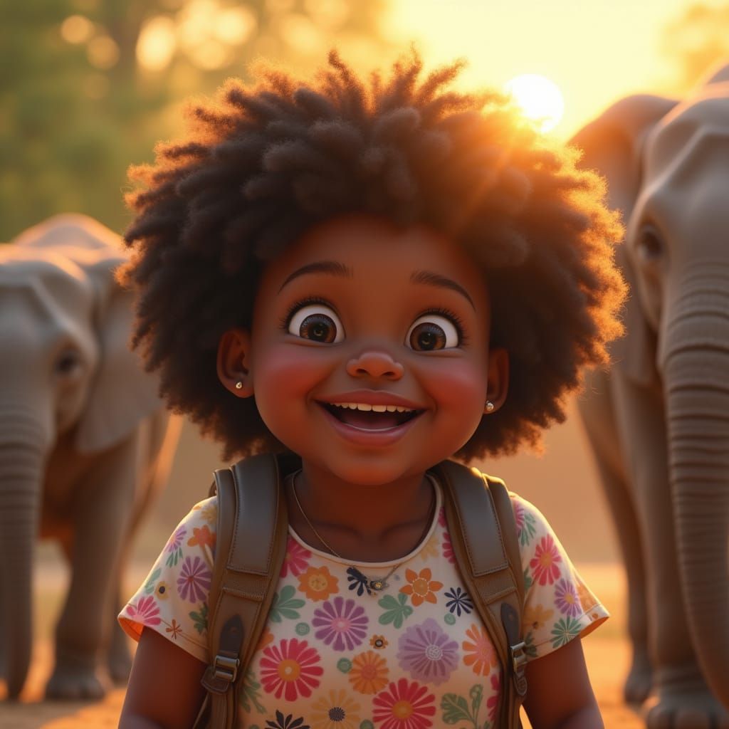 This vibrant image captures a joyful Black teenager surrounded by elephants at the zoo, bathed in warm golden light with a festive atmosphere and rich, textured details inspired by Disney and Pixar aesthetics.