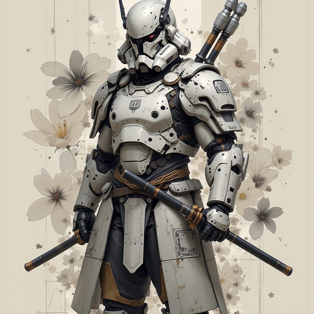 This image shows a stylized abstract samurai warrior figure. The figure wears a white helmet integrated with samurai armor in shades of white, black, and gray, adorned with black floral designs. The figure holds two katana swords and is in a dynamic pose, against a muted beige background with graphic ele...
