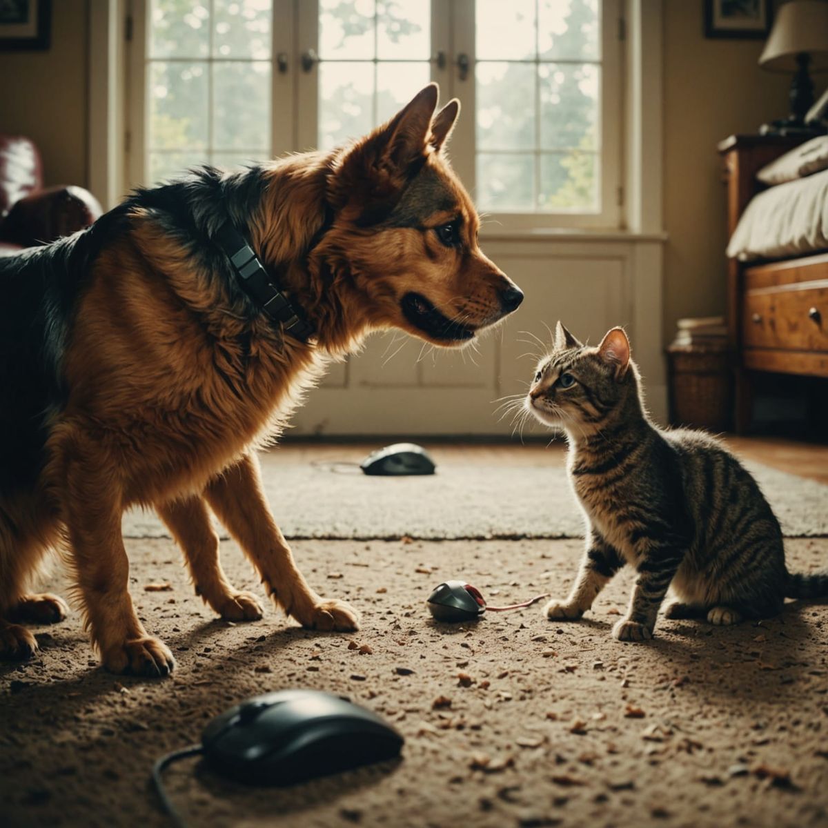 A dramatic and atmospheric cinematic film still captures an epic confrontation between a dog, cat, and mouse. Shot with a vintage film aesthetic, it features rich color grading and stunning lighting.