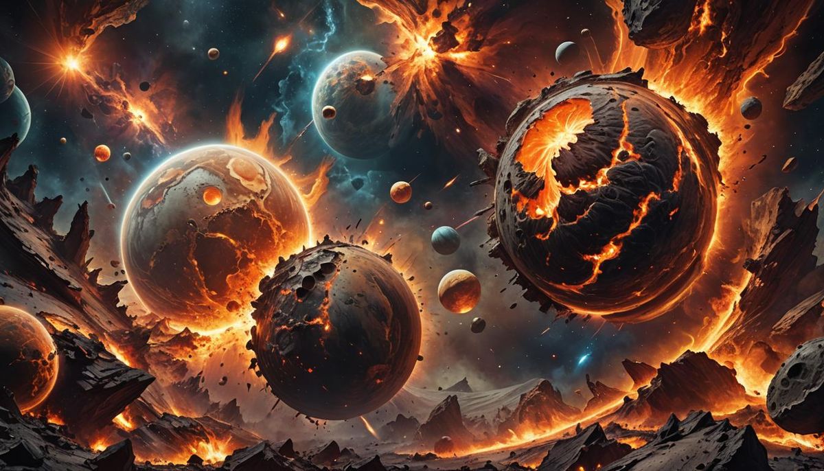 A dramatic wide-angle image of two planets colliding in space. The scene is filled with swirling clouds, deep craters, and fiery debris in a science fiction style with vibrant oranges and yellows.