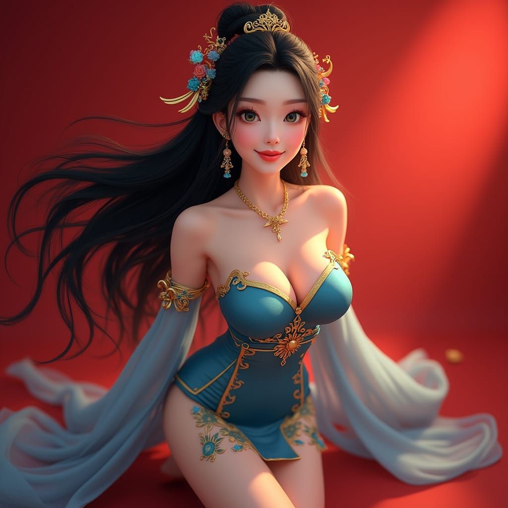 A striking picture of a beautiful Chinese woman with long black hair, wearing a blue and gold dress, against a vibrant red backdrop. This 3D digital art blends fantasy and anime styles.