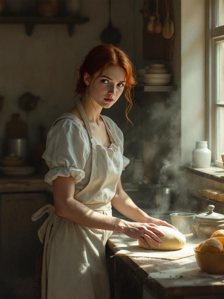 A Vermeer-style image of a 1500s redhead baker glancing at the viewer while kneading dough in a bustling kitchen. The image features dramatic lighting and clean composition, reminiscent of architectural minimalism.