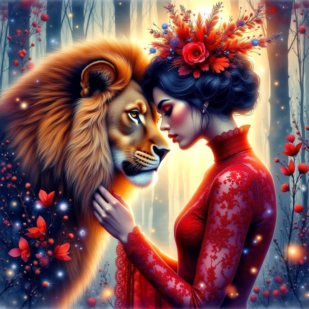 This image is a surreal, dreamlike scene featuring a woman and her majestic lion companion amidst a soft, ethereal background with red vintage lace and warm, golden tones.