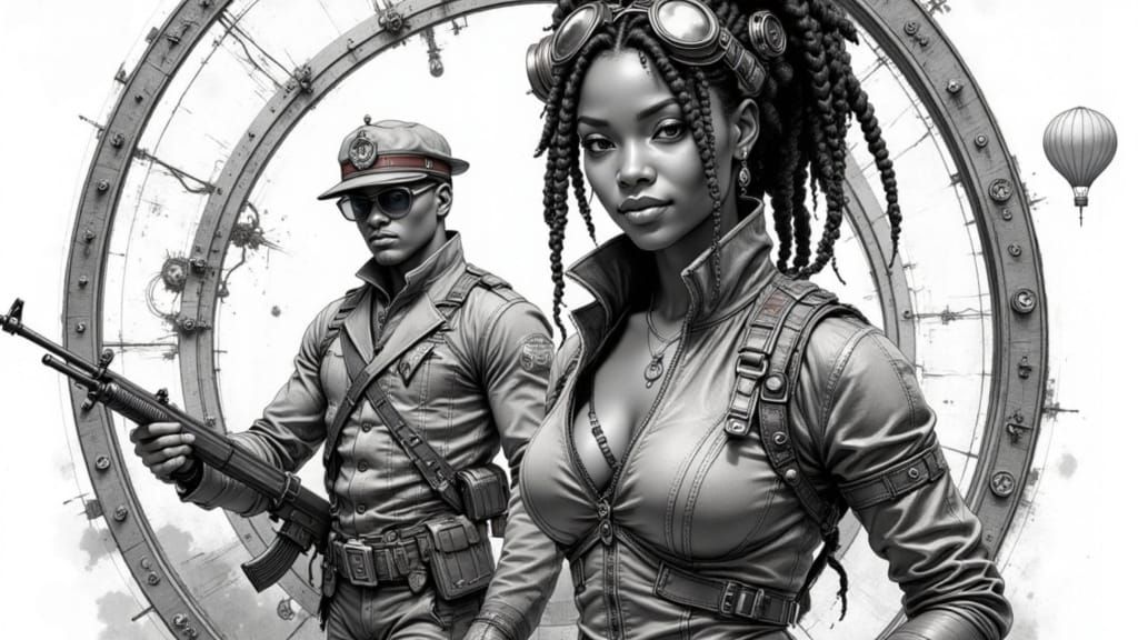 This image showcases a striking, monochrome steampunk illustration of a confident Black woman with intricately styled dreadlocks adorned with gears and goggles. The artwork features detailed linework and dramatic lighting, creating a surreal atmosphere.