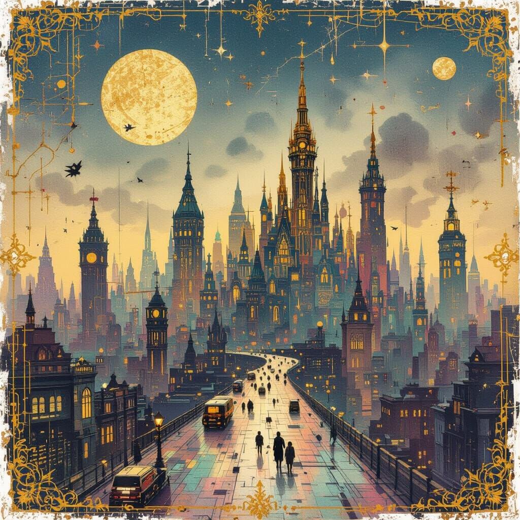 This image features an impressionistic, dystopian cityscape with a vintage glitch aesthetic. It showcases intricate details, vibrant colors, and tiny brush strokes, evoking a mysterious and regal atmosphere.