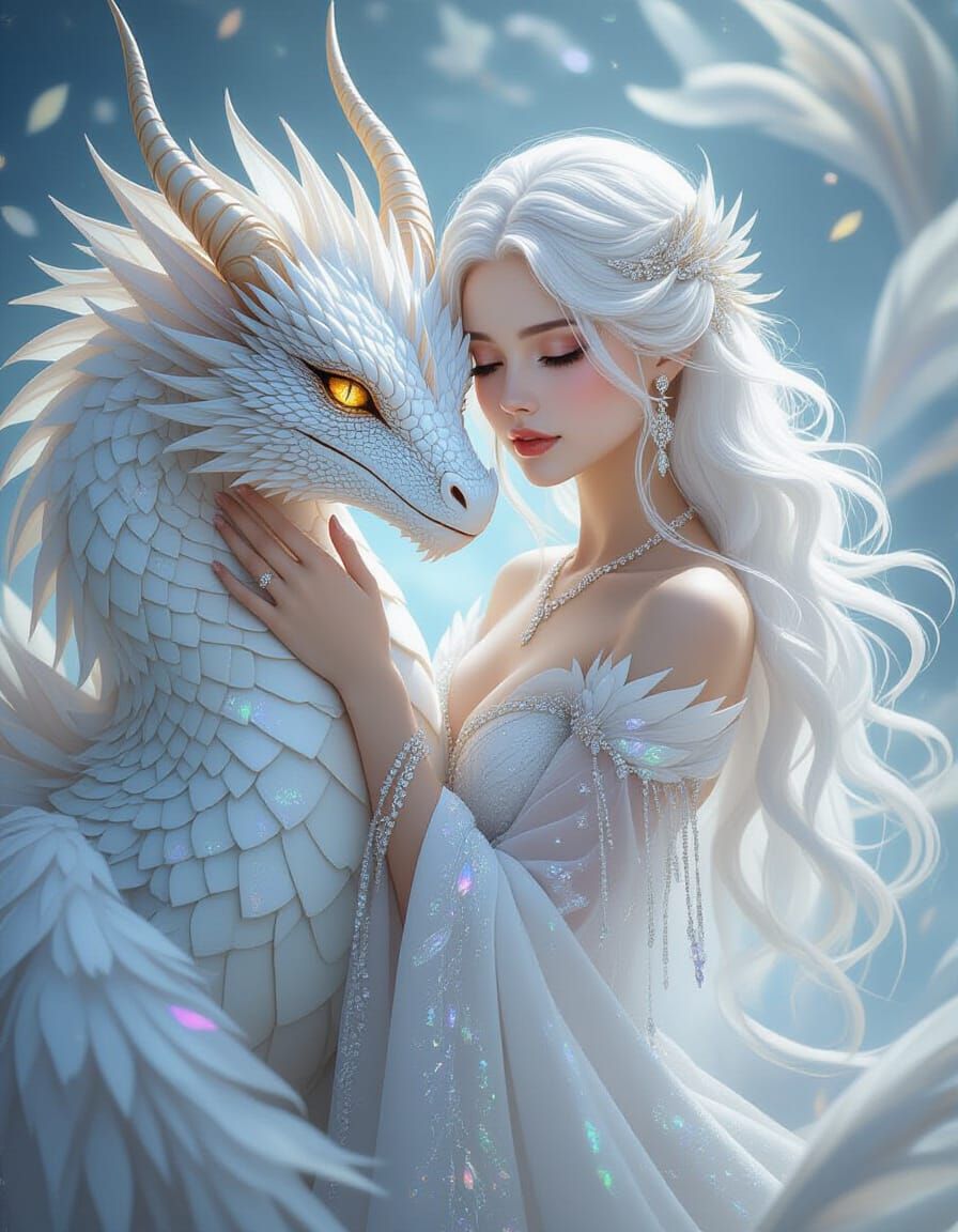 A captivating image of a woman with long white hair embracing a white dragon. The scene is set in an ethereal realm with luminescent clouds and textures in a nouveau art style.