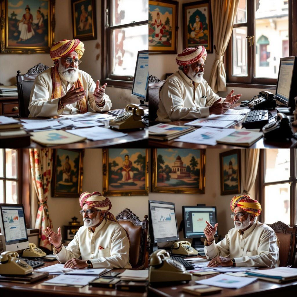 This image shows an elderly Indian stock broker in traditional Marwari attire, discussing market trends in his old Delhi office. Sunlight streams through the window illuminating Rajasthani paintings.