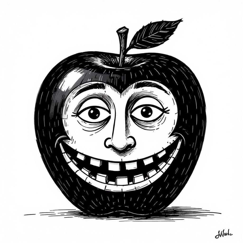 This image shows a partially eaten apple with a face, drawn in black and white. It is rendered with simplified lines and expressive strokes, in the style of a whimsical drawing.
