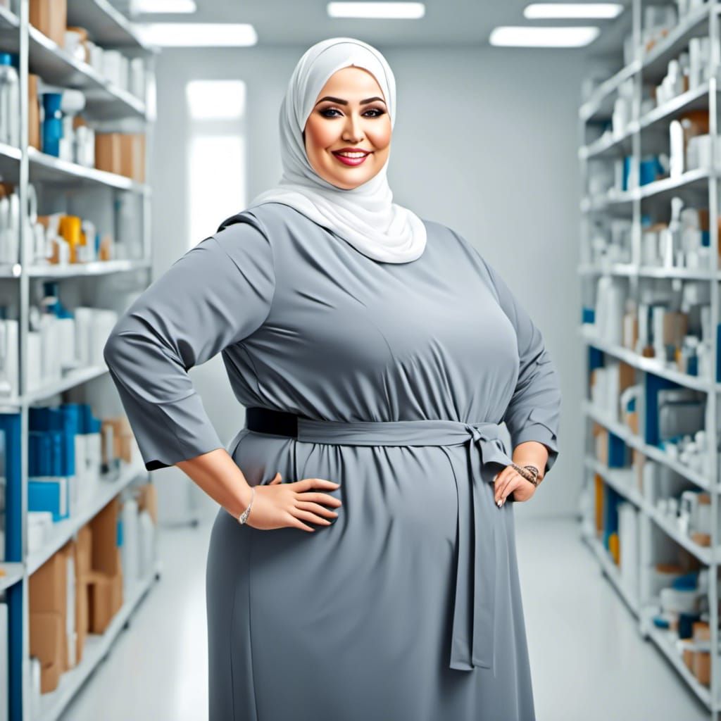 This image shows a plus-size, mature female scientist with silver hair in a lab. The woman has a pronounced double chin, large belly, and big chest.