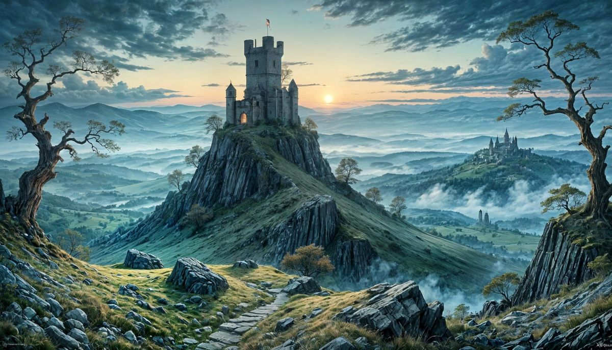 This image shows a mysterious, ruined tower standing on a mountain peak at dusk, with a breathtaking view of the surrounding peaks in the Rhön region, depicted in highly detailed, deep colors.