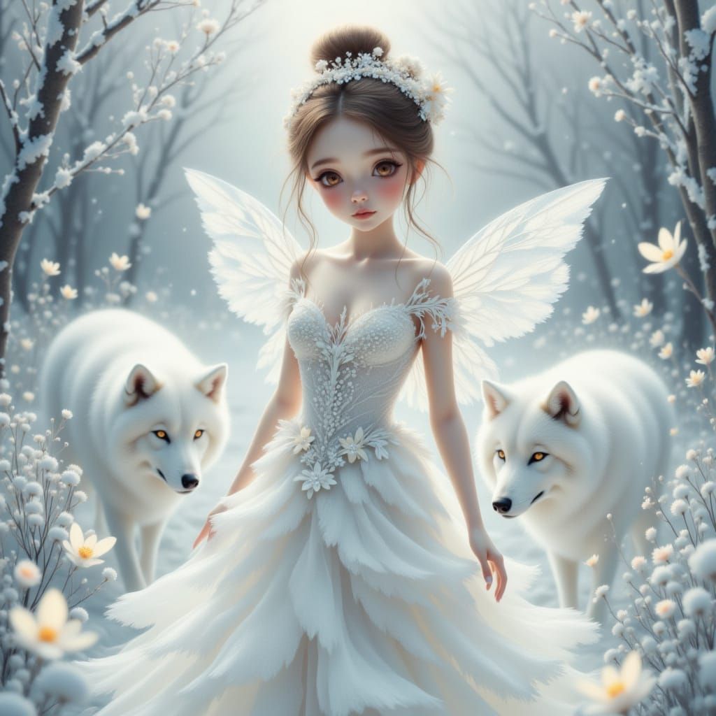 full length. An airbrushed oil painting of a fantasy style snow faerie with brown hair up in a high bun, a crown of tiny white flowers around the bun. She has expressive dark brown eyes, and perfect face and slight smile. Large delicate wings. She is dressed in a fancy white bell gown trimmed with lace ...