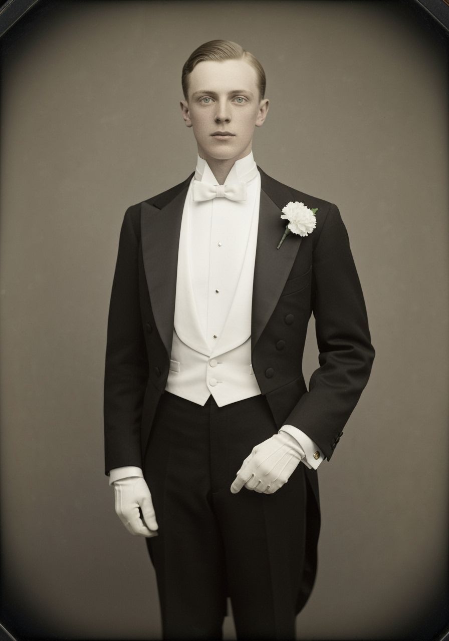 This image shows a tall, pale man in a vintage 1900s tuxedo, presented as a high-contrast daguerreotype portrait with studio lighting and subtle vignette.