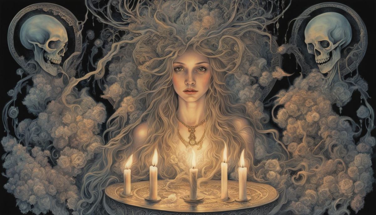 This image shows a translucent witch holding a black cat, her body revealing swirling, watery light. Intricate filigree and cosmic stars adorn her form, set against skulls and tarot cards in a surreal collage style.