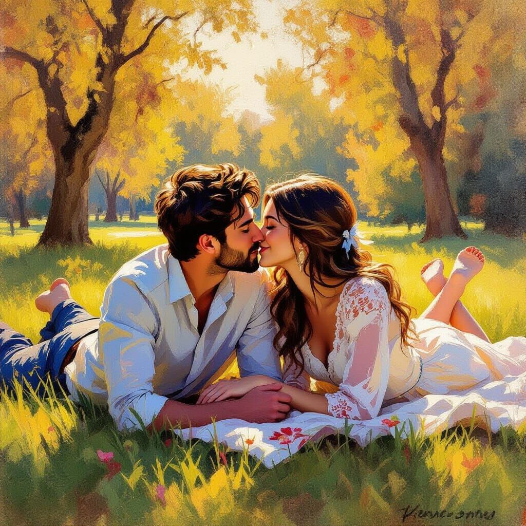 This image depicts a romantic scene of a young couple sharing their first kiss on the grass in a French park. Rendered in an impressionistic oil painting style, it features soft sunlight and vibrant colors.
