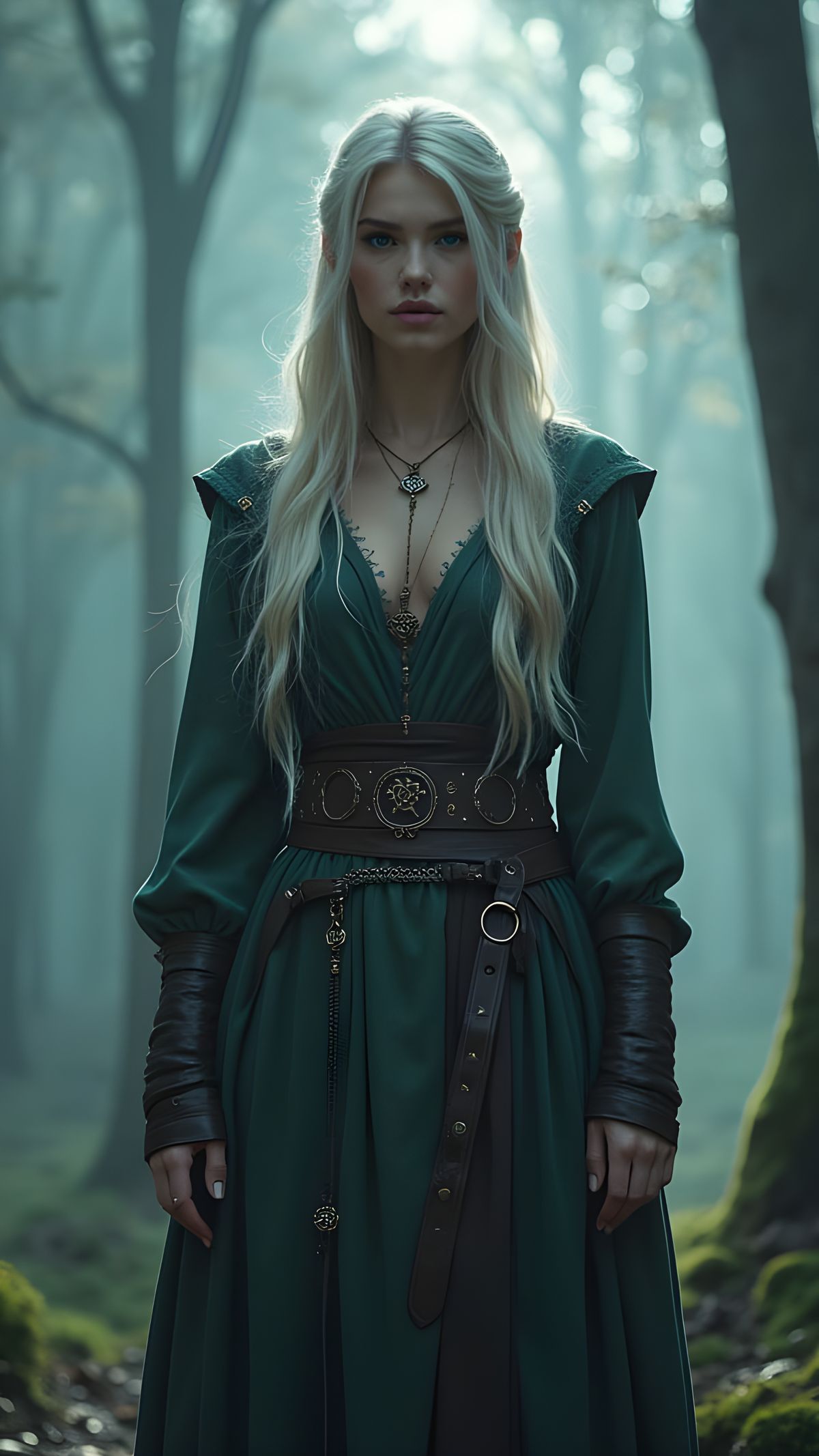 This image shows a mystical woman in an enchanted forest. The semi-realistic fantasy art features glowing runes on her clothing, soft light, ethereal mist, and subtle spirit silhouettes.