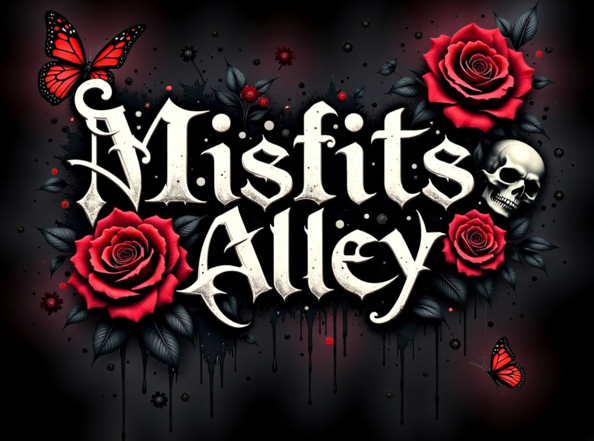 This image shows a gothic logo for "Misfits Alley", featuring distressed serif lettering and dramatic flourishes. A stylized skull, thorny red roses, and hints of butterfly wings add to the elegant, rebellious aesthetic in deep blacks, burgundy, crimson, and ivory.