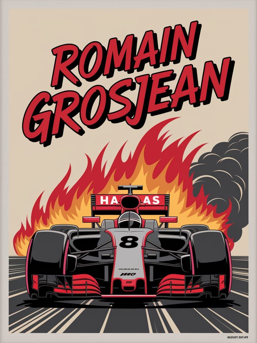 A vibrant digital art poster celebrating Romain Grosjean, featuring his racing number 8 in bold red, set against a backdrop of flames and smoke, capturing the intensity of Formula 1 racing with warm, glowing hues