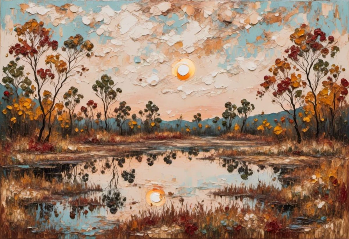 A serene vintage landscape of an autumn pond at sunset with a dramatic sky. The image showcases impasto techniques and a muted color palette, creating a peaceful scene.
