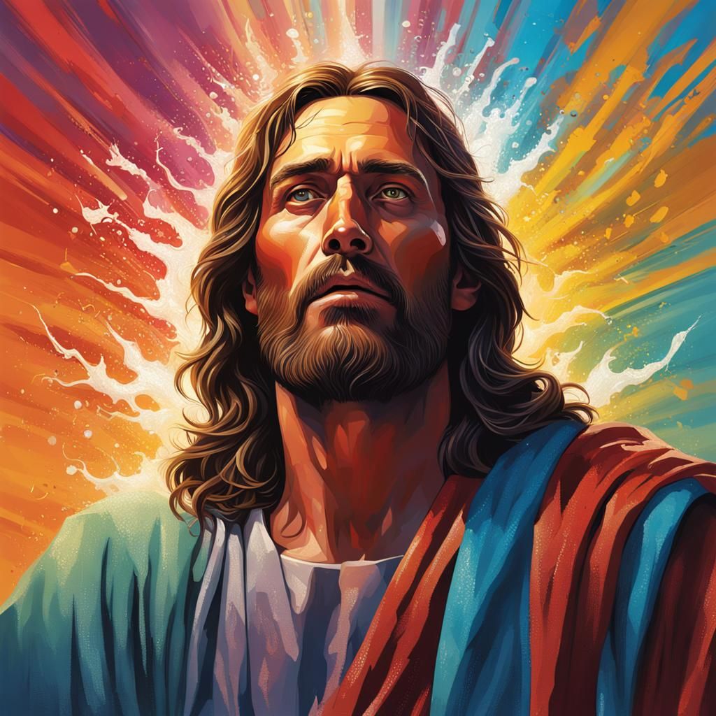 A hyperrealistic image of Jesus Christ with intricate details. The artwork features a colorful background and dramatic lighting with a 2/3 face angle.