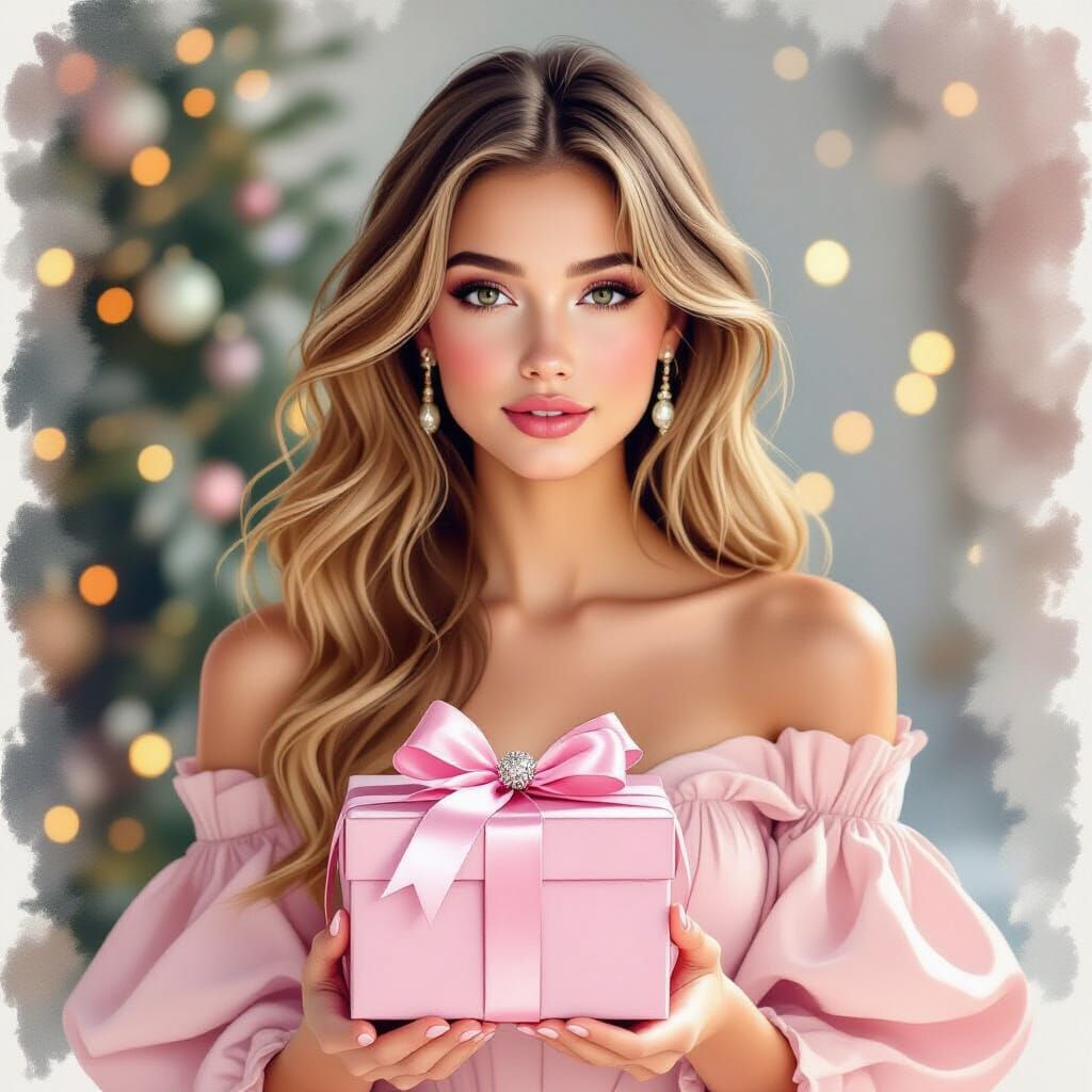 This digital painting captures a young woman with blonde hair in a pink dress, holding a gift. The cozy Christmas background features warm lights and bokeh, rendered in a luminous watercolor aesthetic.