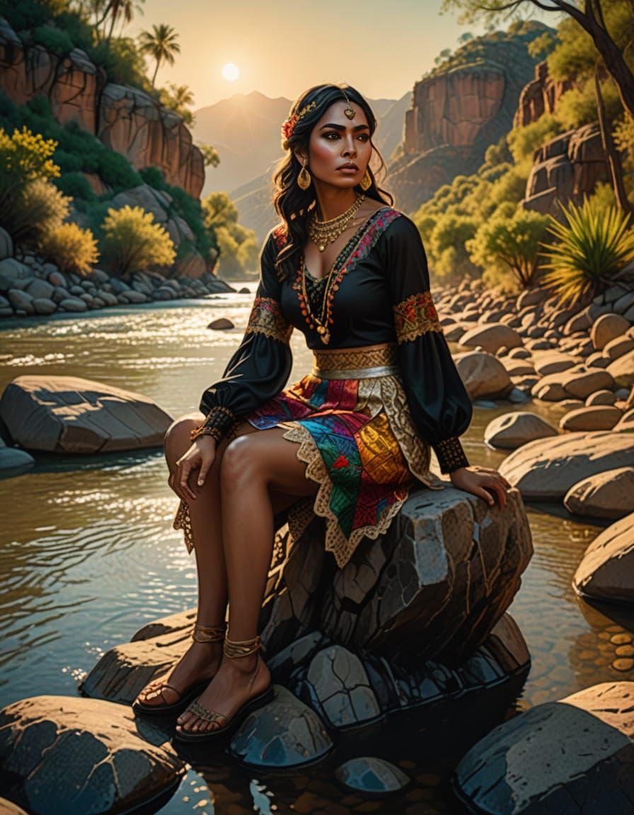This image shows a Mexican woman in a gothic miniskirt sitting by a river. The digital art features vibrant triadic colors, intricate lace details, and soft, warm golden hour lighting.