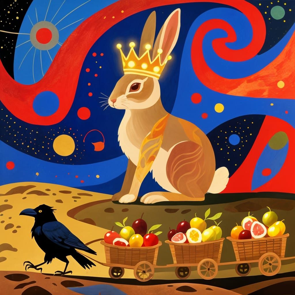 This image depicts a whimsical scene where a rabbit steals fruit from a crown, with elements reminiscent of folk tales and artistic styles inspired by Miro and Rublev.
