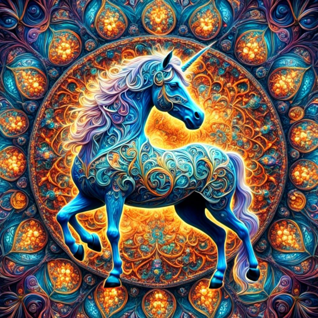 A vibrant digital artwork featuring a unicorn surrounded by fractal patterns and mandalas in a stained glass style. The image is rich in kaleidoscopic, prismatic colors and geometric designs, reminiscent of stained glass art.