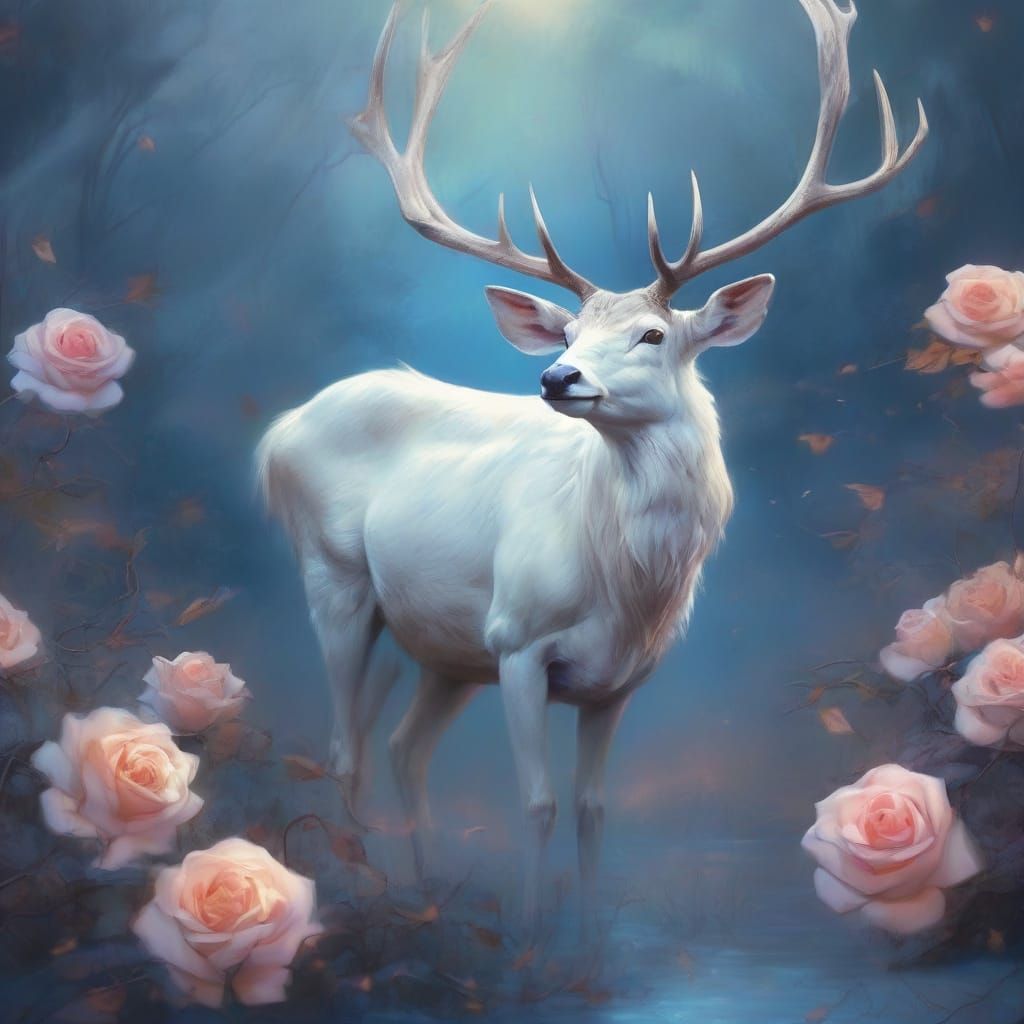 A striking picture of a white stag with glowing antlers adorned with rose vines, set against a bioluminescent sky filled with blue birds. Rendered as a vibrant, detailed digital oil painting.