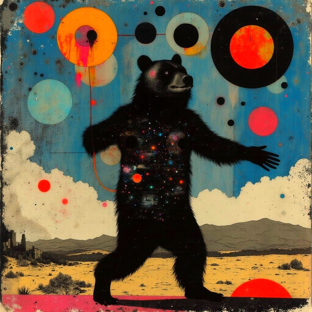 This vibrant image captures a dynamic circus scene with a dancing bear as the main attraction, set against a kaleidoscope of swirling patterns and bold, primary colors. The bear's sleek, geometric costume moves with fluid motion, evoking the works of Art Deco masters and the intricate details of Matte pa...