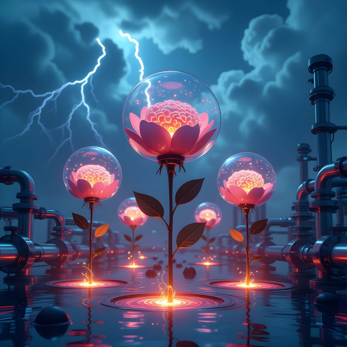 A hyperdetailed, fantastical sci-fi scene of android flowers with exposed glass brains and LED lights, set against stormy skies and pools of metal.