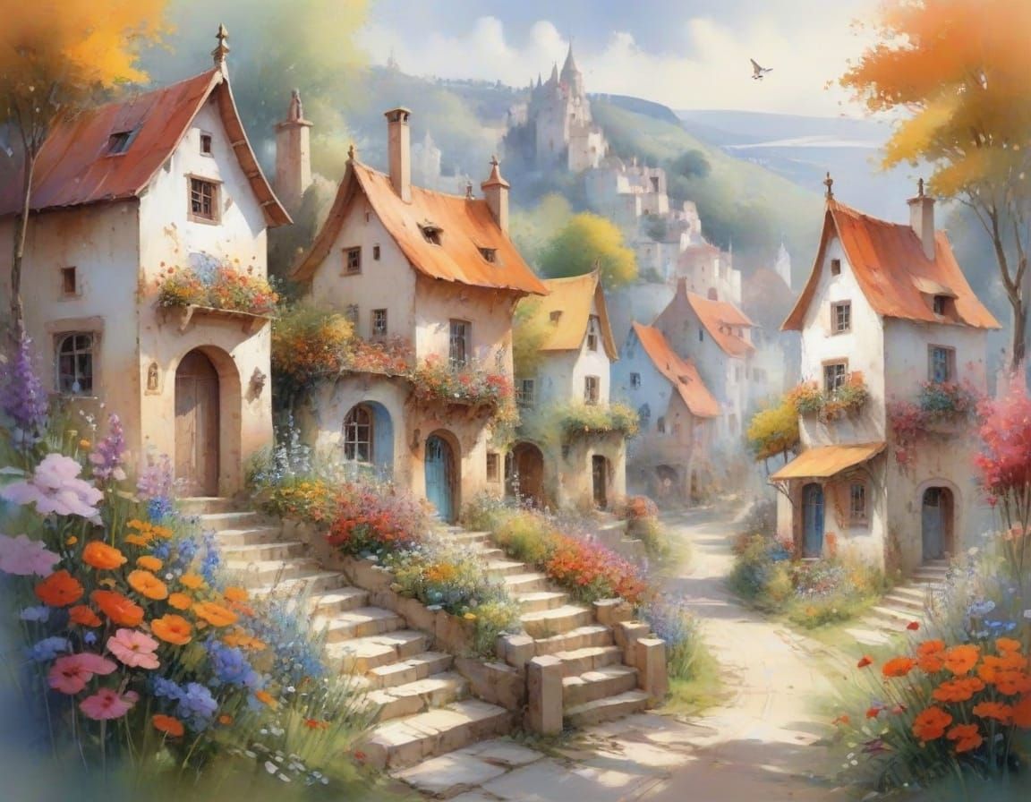 This image shows a whimsical fairy village with colorful houses and wildflower-lined streets. The artwork blends delicate watercolour techniques with ethereal stylization in a painterly style.