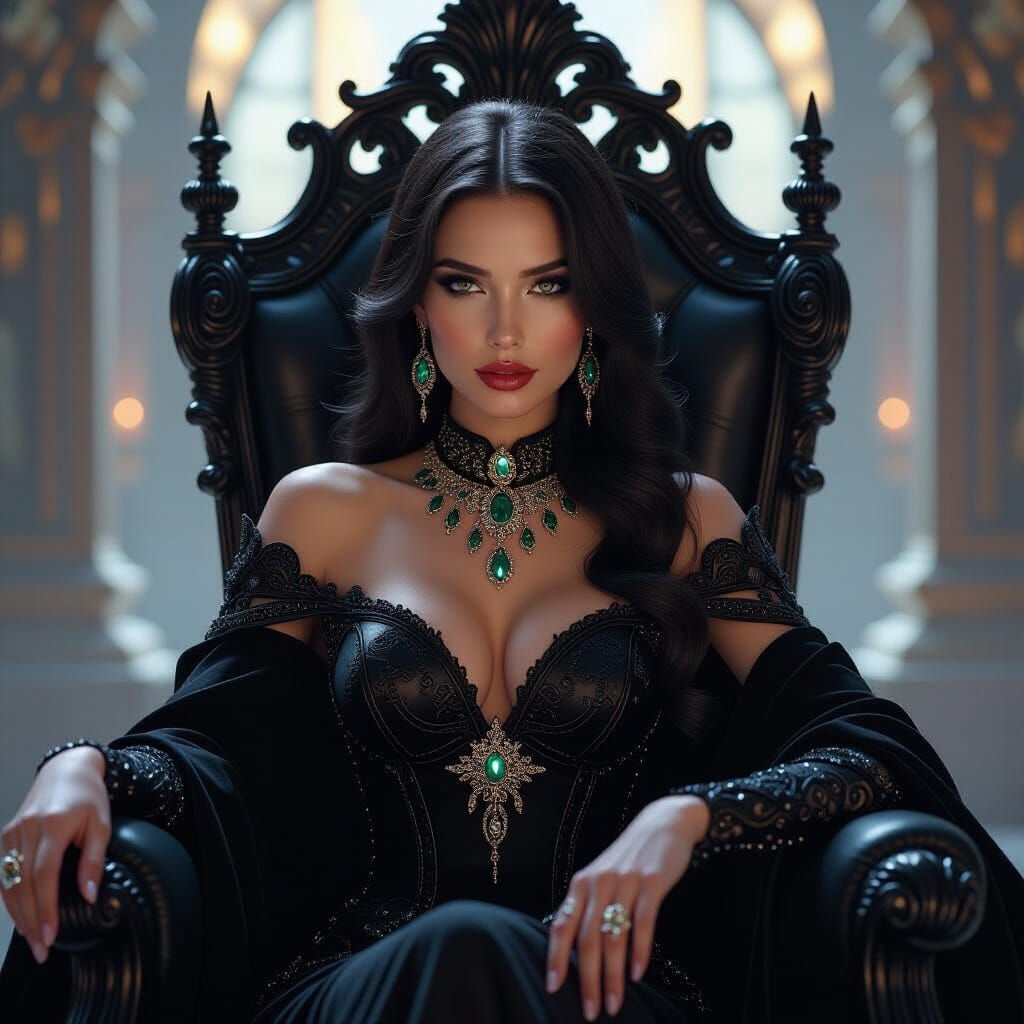 This image shows a dark-haired woman on an obsidian throne, her eyes glowing with arcane power. The image blends art nouveau and cyberpunk elements, using soft lighting and sharp focus to create a striking digital portrait.