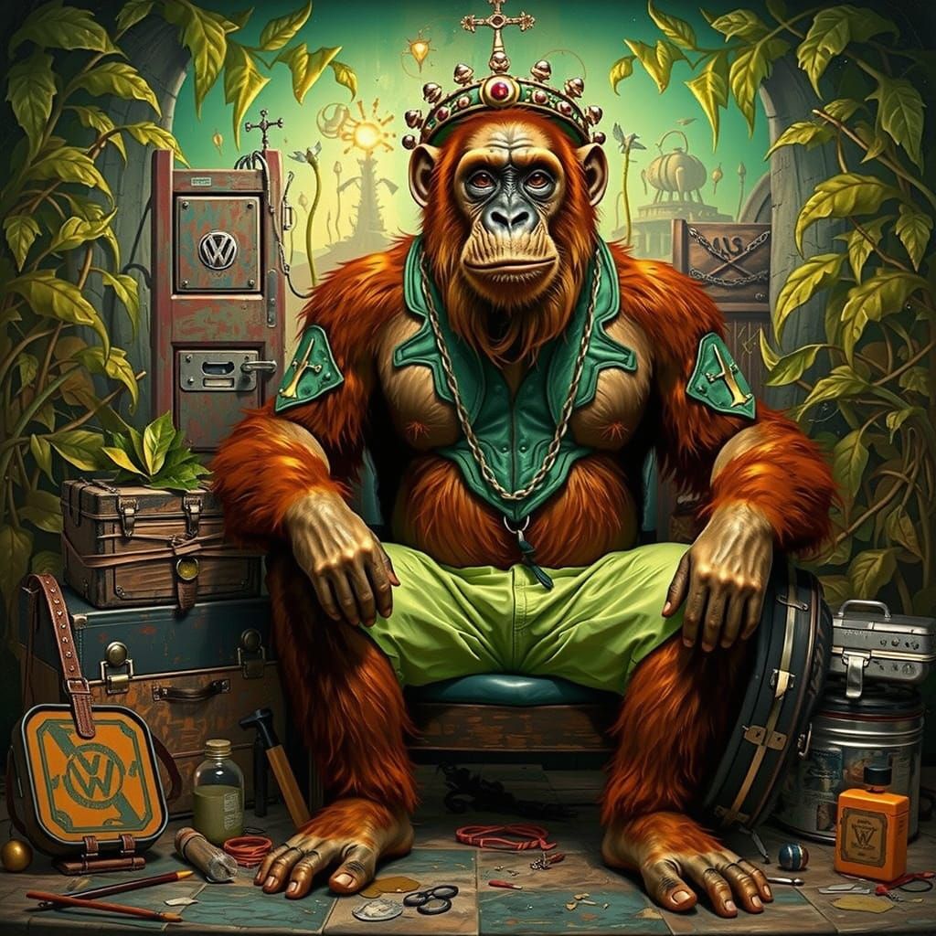 A funny caricature of a monkey in a swimsuit unpacking camping gear from a VW bus. The bus features an oil painting of Burning Man, with metallic accents and textured rippled water.