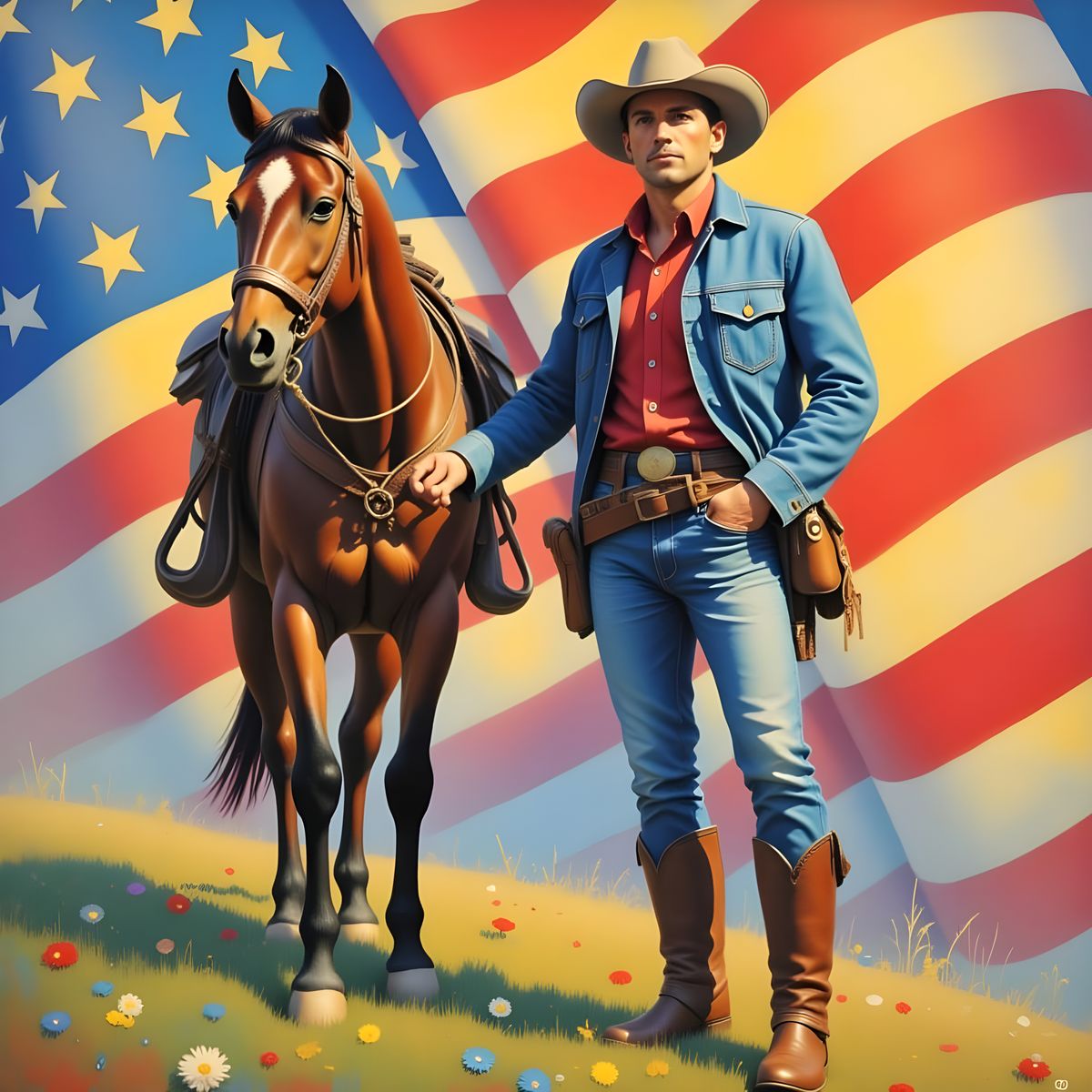 A striking picture of a cowboy and his horse bathed in patriotic sunlight. The image is reminiscent of luminism paintings, with warm colors and intricate details.