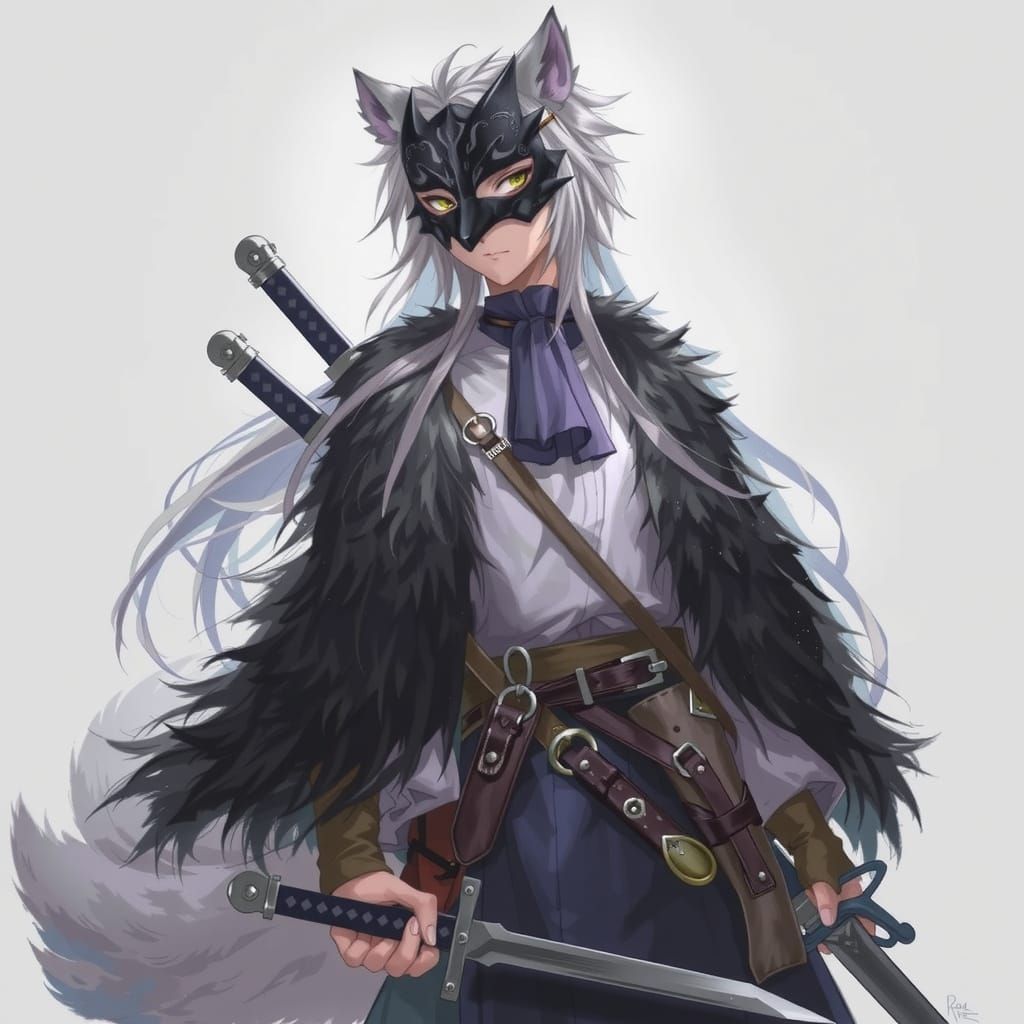 A digital illustration of a wolf-masked warrior with tanned skin and grey wolf features, wielding swords. The character is rendered with intricate details and textured fabrics in an anime style.