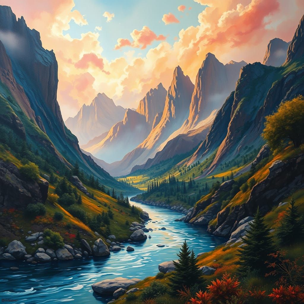 A vibrant image showcasing a mystical mountain landscape and river. This fantasy concept art features rich colors, intricate details, and impasto brush strokes, rendered as a detailed digital painting.
