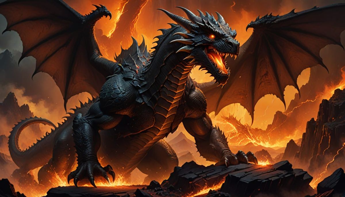 This image captures a close-up of a colossal fire-breathing dragon perched atop a molten volcanic cliff, surrounded by a dramatic and apocalyptic atmosphere, with glowing red-hot scales and massive wings unfurled.