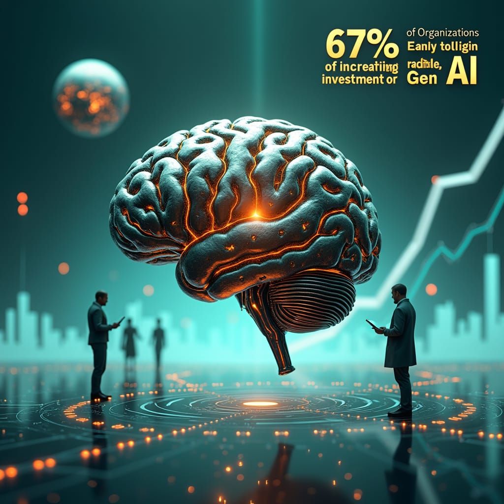 A digital artwork showing a metallic brain with gears against a high-tech backdrop. The image shows rising arrows, charts, business leaders and a glowing globe. The artwork uses a vibrant color palette and 3D matte painting.