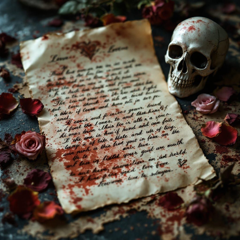 A vintage, highly detailed image of a dusty love letter adorned with rose petals and a skull, set in a creepy, luminous Victorian scene.
