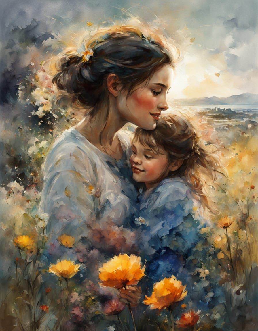 This image shows a heartwarming watercolor scene of a mother and daughter surrounded by vibrant flowers, a curious cat, and a bright blue sky, capturing the essence of motherly love in a beautifully detailed and textured fine art piece.