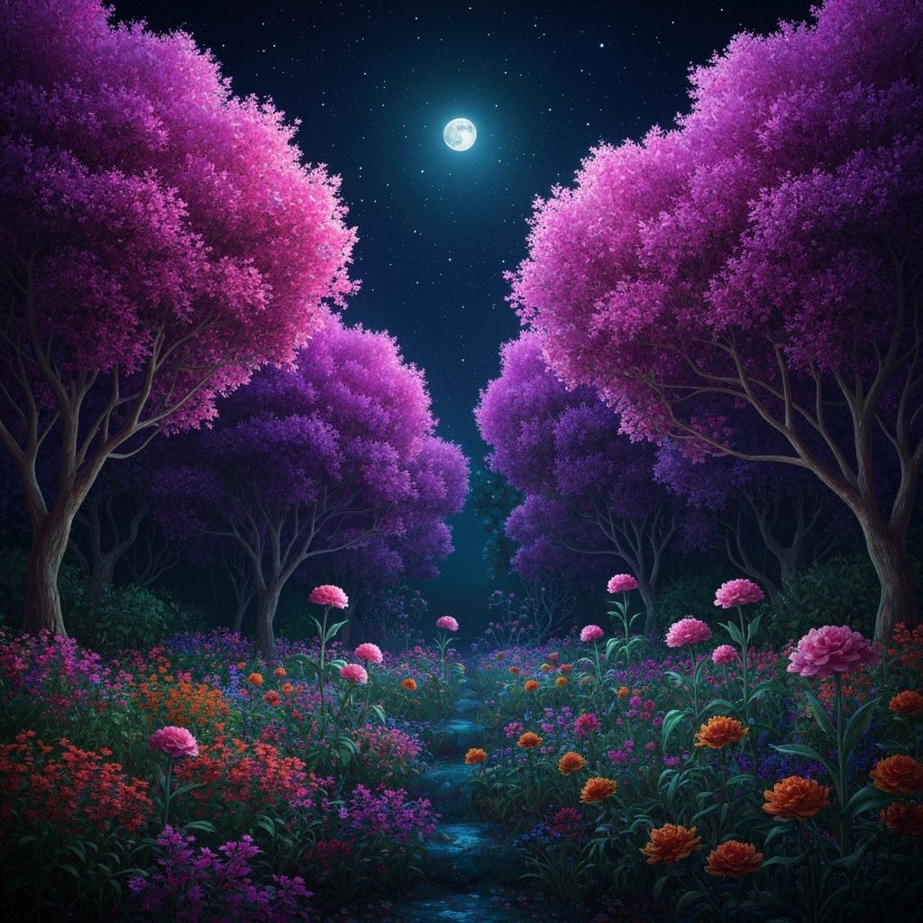 This AI-generated image depicts a vibrant, psychedelic garden under a starry, moonlit sky. It features deep, complementary fantasy colors and an intricate, detailed concept art style.