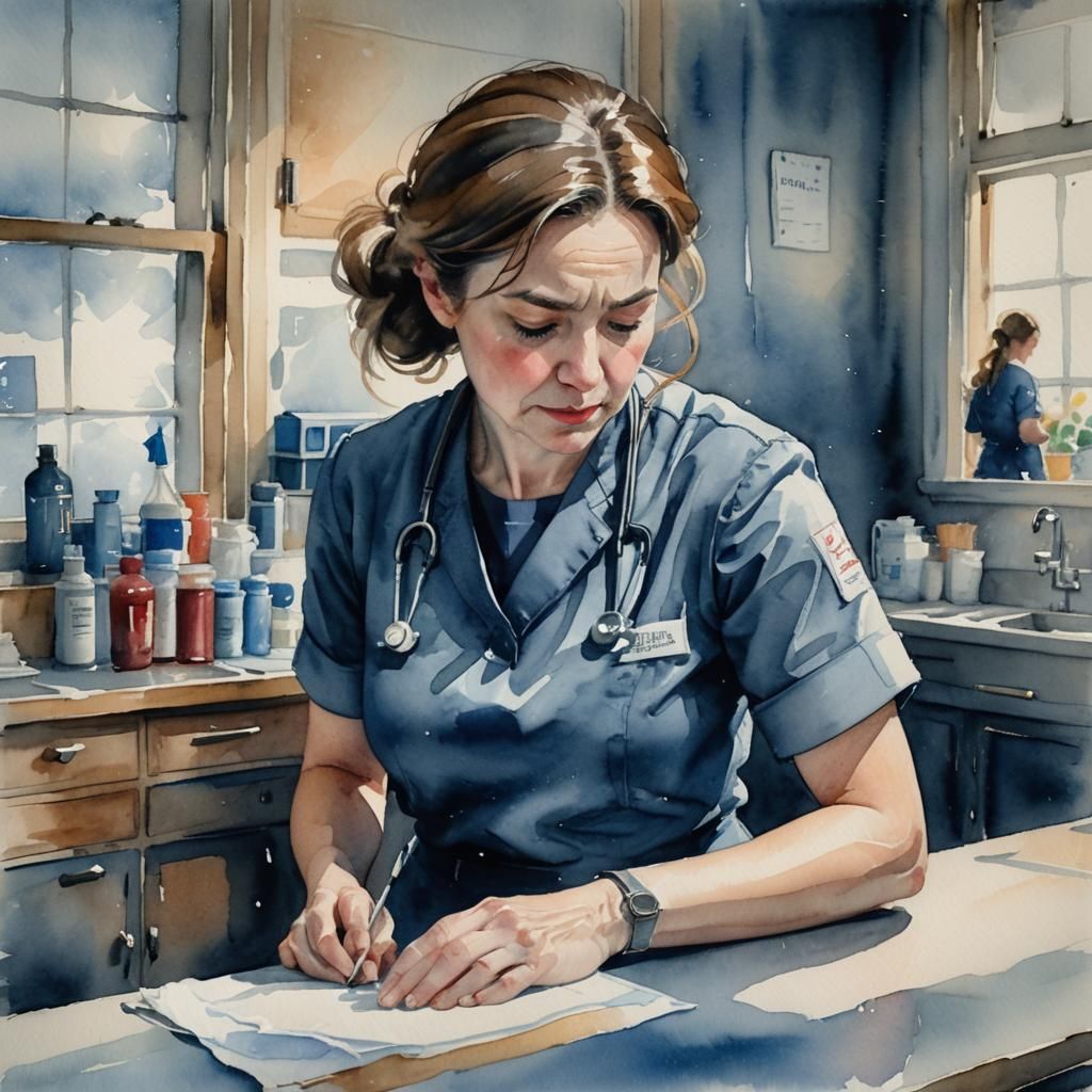 A watercolor portrait of a tired nurse in blue scrubs leaning against a counter. Soft, gentle hatching and brushstrokes create a nostalgic, impressionistic atmosphere with warm lighting and cool shadows.