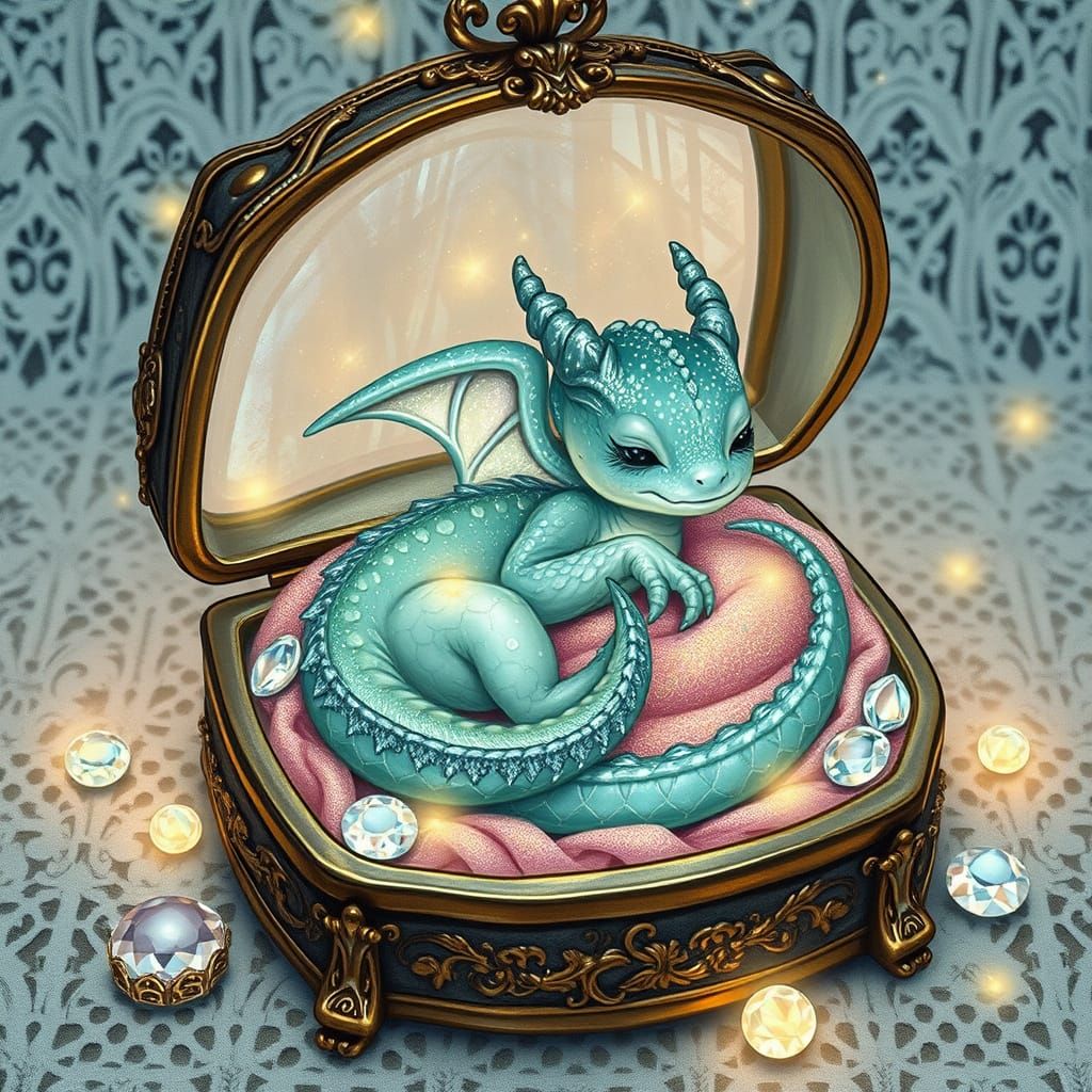 A bioluminescent dragon hatchling snuggles inside an ornate glass jewelry box, surrounded by glittering gems and softly glowing treasures. T...