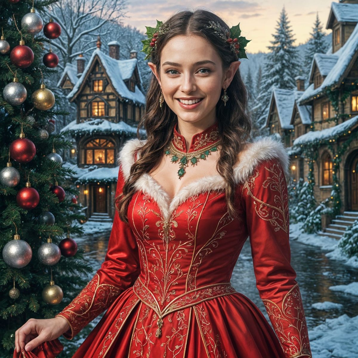 This hyperrealistic image shows a beautiful elf woman in a detailed Christmas dress, smiling happily in a natural, highly detailed scene.